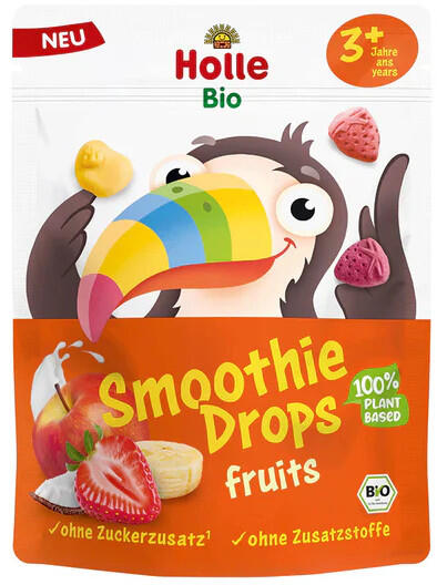 Fedezze fel a finom Holle Smoothie Drops gyümölcsöket - egy vegán, fagyasztva szárított gyermek snack, amely a tiszta gyümölcsöt krémes kókusztejjel kombinálja. Ezek a ropogós cseppek, amelyek rövid idő után elolvadnak a szájban, gyümölcsös és ízletes csemegét kínálnak minden kis és nagy nassolásrajongónak. A 100%-ban bio alapanyagokból és hozzáadott cukor nélkül készült, a kíméletes fagyasztva szárítás megőrzi az értékes vitaminokat és a gyümölcs természetes ízét.
